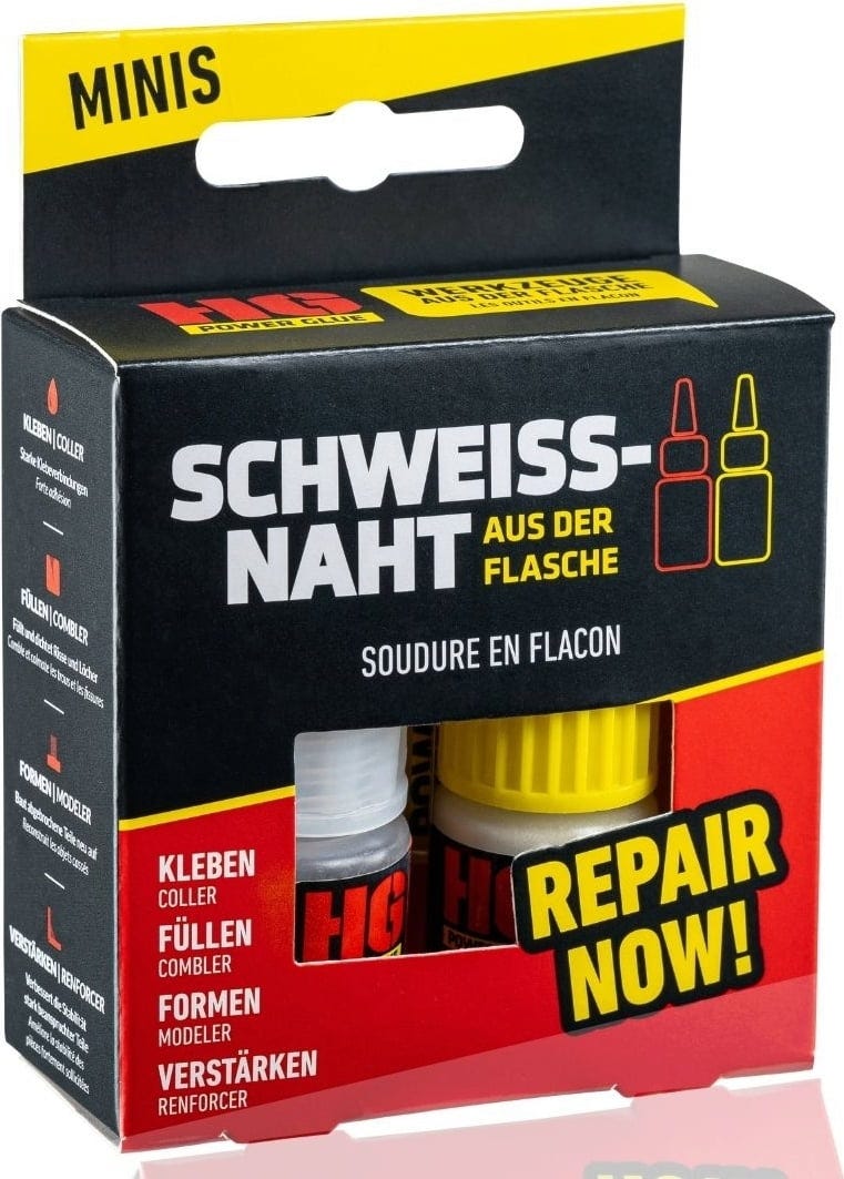 La Soudure en Flacon "Mini" de HG Power Glue est un système de collage bicomposant haute performance composé de granulés et de colle, développé pour créer des assemblages particulièrement solides et résistants. Il convient parfaitement aux réparations pour lesquelles une colle instantanée classique atteint ses limites.