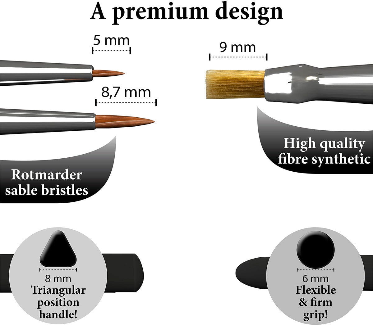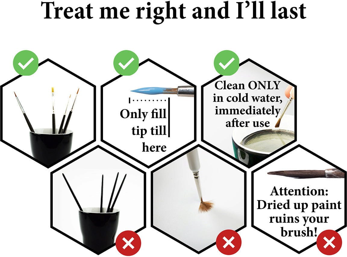Les trois pinceaux inclus sont spécialement choisis pour couvrir toutes les techniques importantes : peinture de détail (Detailpainting) précise, couches de base (Basecoats) uniformes et brossage à sec (Drybrushing) efficace. Ainsi, vous avez le pinceau adapté à chaque situation à portée de main. Grâce aux manches ergonomiques triangulaires, les pinceaux tiennent particulièrement bien en main et vous offrent un contrôle maximal, même lors de longues séances de peinture.
